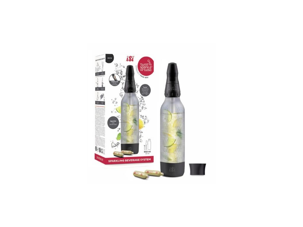 Sada na výrobu sódy Twist & Sparkle od spoločnosti iSi vám umožní rýchlo a jednoducho pripraviť sódu a rôzne šumivé nápoje v pohodlí vášho domova. Pomocou tejto sady môžete vytvoriť rôzne koktaily, nealkoholické nápoje, sódy ochutené vašimi obľúbenými bylinkami a ovocím, perlivé džúsi alebo čaje. Celý systém je veľmi skladný. Použitie je jednoduché, stačí naplniť fľašu vodou (max. 950 ml) alebo iným nápojom (max. 720 ml), vložiť sifónovú bombičku s CO2 do hlavice, nasadiť hlavicu na fľašu a počkať 1 minútu pokiaľ sa obsah fľaše presýti.